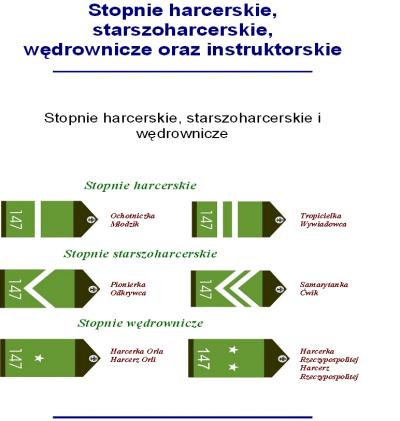 - Znam nazwy stopni harcerskich i instruktorskich oraz sposób ich oznaczania na mundurze. Wiem, jakie sznury noszą instruktorzy komendy hufca, komendy chorągwi, Głównej Kwatery i Przewodniczący ZHP. Znam ich miejsce w strukturze ZHP.